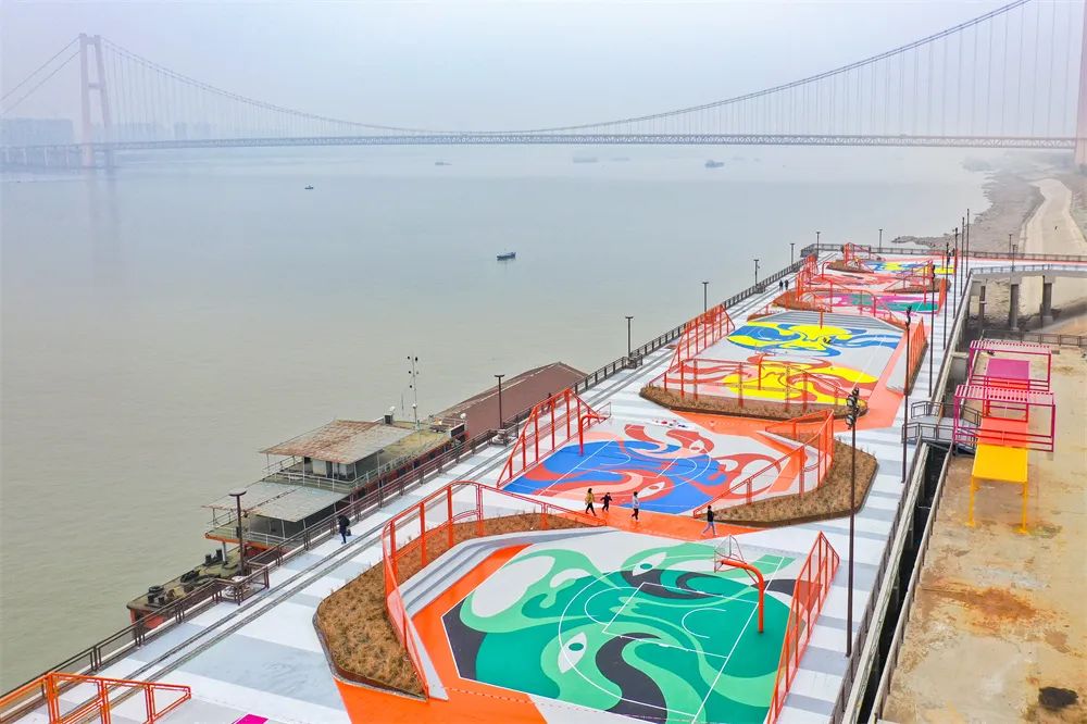 ? ? ? ?除了對原有碼頭元素創(chuàng)新改造,高樁平臺上的活動區(qū)域也亮點紛呈:平臺兩端都建設了約兩米寬的玻璃棧道,站在上面,低頭就可以看見滾滾奔流的長江水;面向江心左邊,是全國唯一的國風籃球場,從空中俯瞰,精致的京劇臉譜整齊排列在球場內,為岸線添上一抹色彩。正是通過這種漸進式改造,讓更多城市歷史文化記憶在江灘活起來、傳下去。