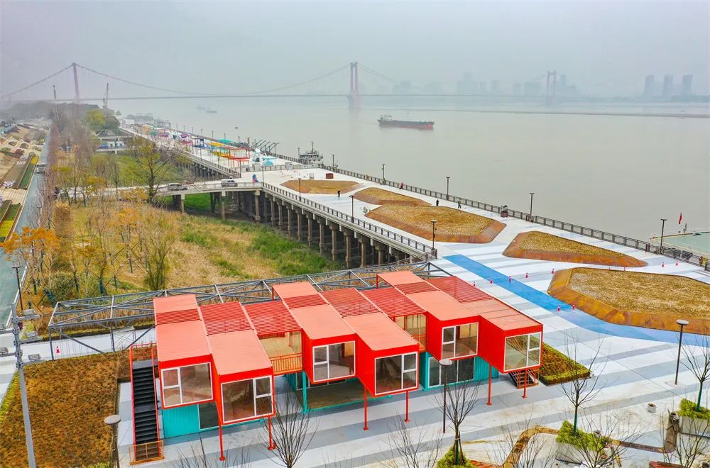 ? ? ? ?原碼頭伸向江心的高樁平臺被保留下來,以“浮江展廳”為設計理念,進行整體規(guī)劃。龍門吊和集裝箱是碼頭最具代表的工業(yè)元素,慶典廣場,一座巨型龍門吊被保留在了廣場中央,改造成了長江江面上的第一處水幕電影的“放映機”,可以作為大型活動、表演場地。一旁的集裝箱工坊則可用于驛站或服務中心,更重要的是,集裝箱和拼裝式防洪墻可根據(jù)防汛需要即時拆建。